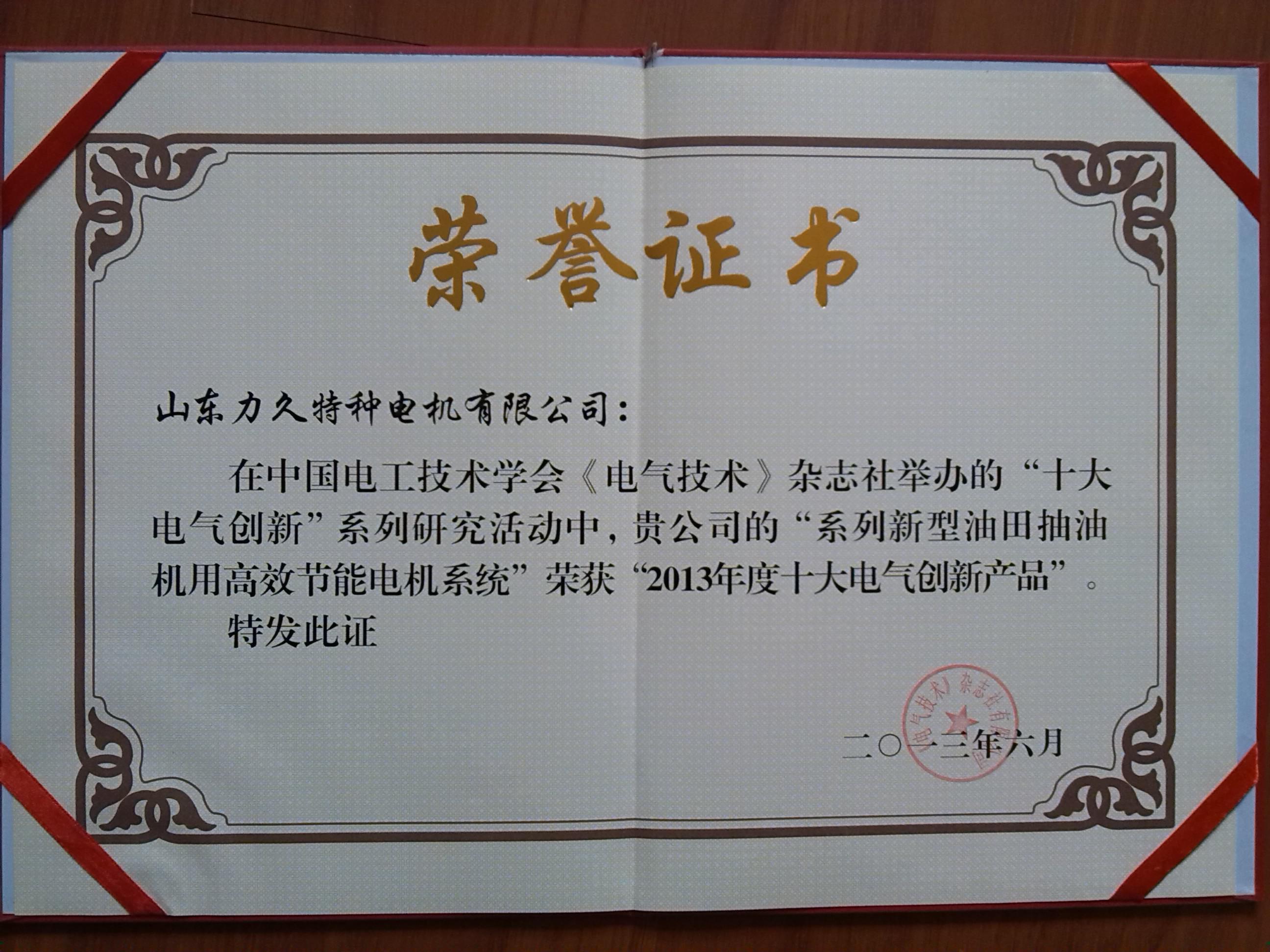 鑒于此,2013年6月,山東力久電機公司研發的上述多項新型油田抽油機用高效節能電機系統,在中國電工技術學會《電氣技術》雜志社舉辦的“十大電氣創新”系列研究活動中,榮獲“2013年度十大電氣創新產品”榮譽稱號。