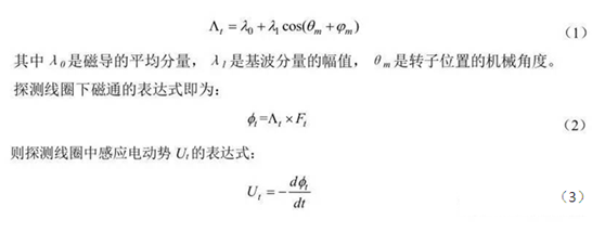 而當電機發生動偏心故障時,定、轉子間氣隙不再呈均勻分部,而在空間中隨轉子位置旋轉而周期性的變化。如果忽略高次諧波,則電機各探測線圈下的磁導率是轉子位置的函數,如式(1)所示。
