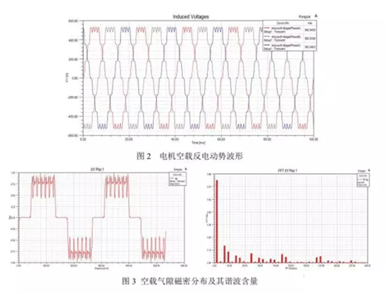 首先,有限元分析了該電機模型的空載特性,包括求解空載反電動勢,反電動勢的諧波含量,氣隙磁場中的徑向磁密分布。永磁同步電機空載時,由于電樞電流很小,電機內僅有永磁體所建立的永磁磁場(主磁場和漏磁場)。空載反電動勢是永磁同步電機的一個非常重要的參數,E0的大小對電機的動、穩態性能都有很大的影響,合理地設計電機的E0可以降低空載電流,提高功率因數和效率,降低電機溫升。經分析,本次設計的永磁同步電機空載反電勢的幅值與外加電壓U的幅值的比值在0.95左右,證明該電機的設計是成功的,具有良好的空載特性。