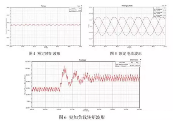 進一步,對永磁同步電機額定負載下的穩態特性進行了仿真,求取了其輸出轉矩的波形以及定子繞組銅損、鐵芯損耗(包括鐵芯磁滯損耗與渦流損耗);另外求解分析了電機從半載到滿載的動態過程,證明了電機具有較好的帶載能力和動態性能。為接下來進一步的仿真分析建立了基礎。