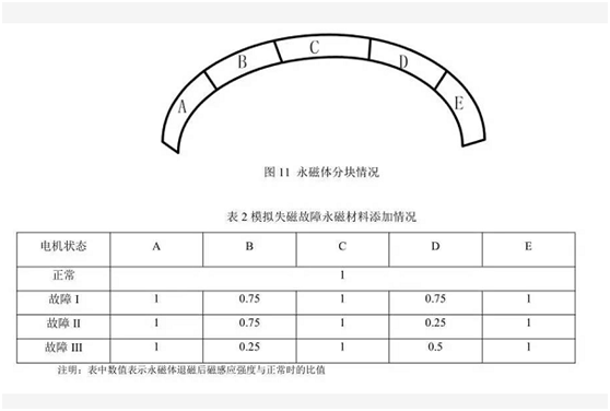 永磁體發生失磁有可能是局部的,也有可能是均勻的。為了模擬電機發生失磁故障狀態,將電機的每一個瓦片形磁極任意分為A、B、C、D、E共5塊大小不等的小磁極,將不同磁感應強度大小的永磁材料分配給每一塊小區域,用以模擬失磁故障的發生。