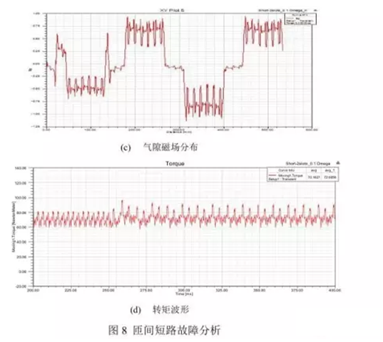 結果表明,在故障初期,也就是短路電阻較大時,短路電流if較小,故障現象不明顯,短路處的發熱不大。隨著故障的發展,短路電阻迅速減小,短路電流增大,短路處的發熱量增大,使得絕緣迅速失效,故障進一步加劇,最終導致繞組完全短路,燒損。因此,短路電流應是評價電機故障程度的一個重要指標。同時,通過對輸出轉矩的分析,匝間短路故障導致了轉矩波動的增加,這表明了氣隙磁場發生了畸變。